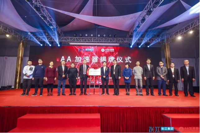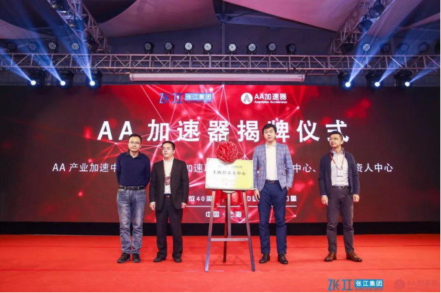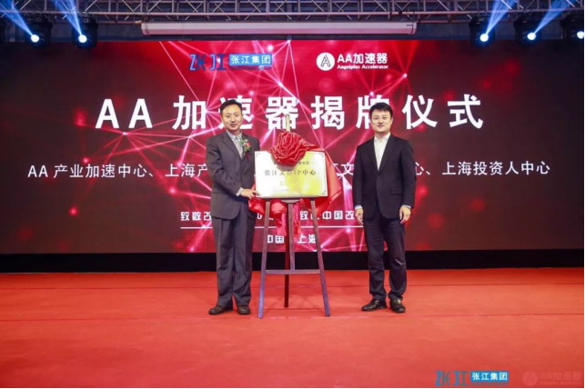 中国(上海)自由贸易试验区管理委员会张江管理局副局长付军、上海张江(集团)有限公司董事、党委委员、副总经理鲍纯谦、AA加速器创始人吴玲伟、AA加速器上海合伙人施淼共同为AA上海产业中心揭牌。