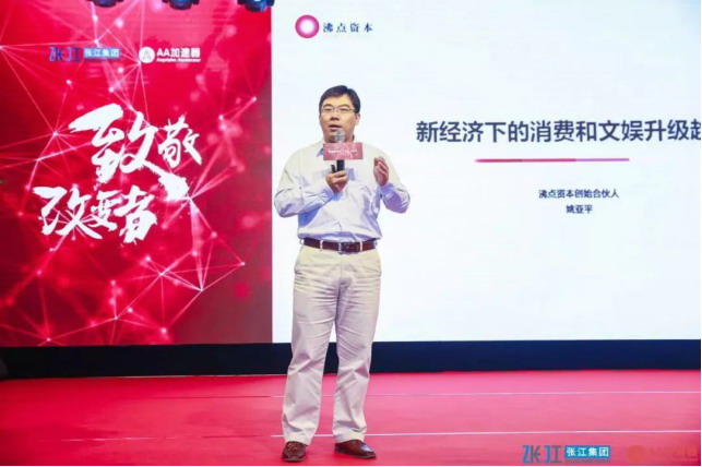 第三位演讲嘉宾是沸点资本创始合伙人姚亚平先生,他发表了题为《新经济下的消费和文娱升级趋势》的趋势说。
