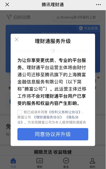 近日,陆续有用户收到了腾讯理财通平台发布的“理财通服务升级”公告,主要内容是平台运营主体迁移。根据公告内容,理财通平台运营主体将由财付通公司迁移至腾讯旗下的上海腾富金融信息服务有限公司(以下简称“腾富公司”)。