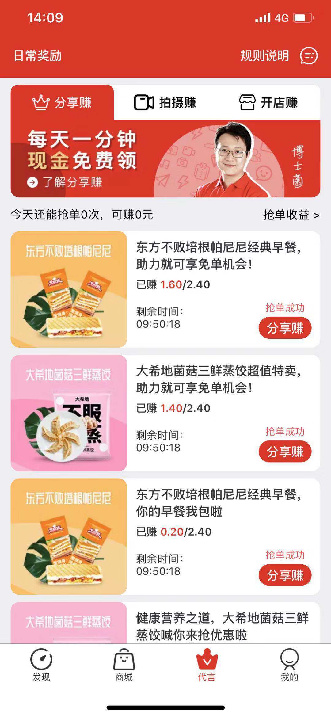 近日,纷来V2.9.0正式上线,在本次版本更新中,纷来又双叒叕发布了一个超级简单的分享赚功能:代言人进入代言页面后,只需要选择分享赚,分享任何一个活动商品的链接、海报或视频给朋友,朋友点击之后即可获利!