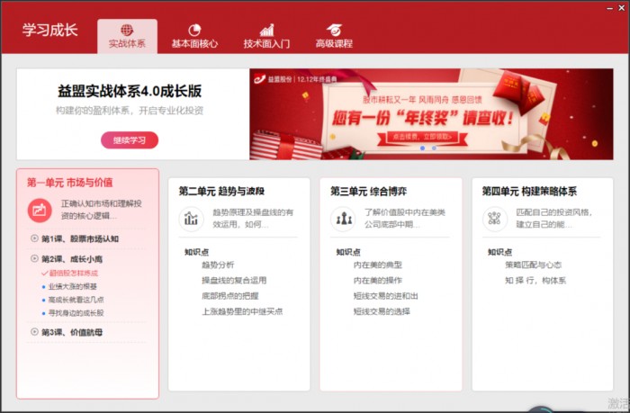 为加强投资者对市场认知,益盟智盈大师还增加专家盯盘、数据盯盘等功能帮助用户及时掌握市场异动,另有投资顾问+成长顾问深度陪伴。除此之外,软件还推出实战体系4.0成长版、基本面核心、技术面入门、高级课程4类视频教学方案,全方位提升个人投资者对股票市场的认知以及操盘能力,使股市小白快速成长为一名专业的股民。