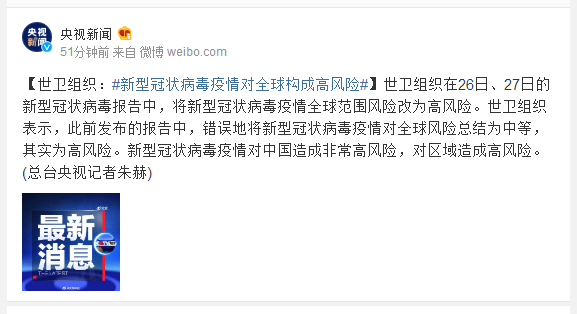 【世卫组织:#新型冠状病毒疫情对全球构成高风险#】世卫组织在26日、27日的新型冠状病毒报告中,将新型冠状病毒疫情全球范围风险改为高风险。世卫组织表示,此前发布的报告中,错误地将新型冠状病毒疫情对全球风险总结为中等,其实为高风险。新型冠状病毒疫情对中国造成非常高风险,对区域造成高风险。(总台央视记者朱赫)