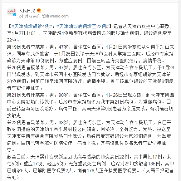 第19例患者李某某,男,47岁,居住在河西区,1月21日乘坐高铁从河南平顶山来津,同车有武汉旅客。于1月25日就诊于天津市医科大学第二医院,后经市专家组确诊为天津第19例病例,为重症病例。目前已转至海河医院治疗,病情平稳。