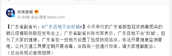 今天举行的广东省新型冠状病毒感染的肺炎疫情联防联控发布会上,广东省副省长张光军表示,广东各地不会“封城”,但为了大家的健康,广东省在一些地方设置了检疫防疫站点,依法开展健康监测管理,公共交通工具要定期开展消毒,会降低一些通行效率,请大家理解配合。(总台央视记者陈旭婷)