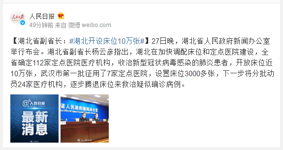 27日晚,湖北省人民政府新闻办公室举行布会。湖北省副省长杨云彦指出,湖北在加快调配床位和定点医院建设,全省确定112家定点医院医疗机构,收治新型冠状病毒感染的肺炎患者,开放床位近10万张,武汉市第一批征用了7家定点医院,设置床位3000多张,下一步将分批动员24家医疗机构,逐步腾退床位来救治疑似确诊病例。