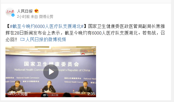 国家卫生健康委医政医管局副局长焦雅辉在28日新闻发布会上表示,截至今晚约有6000人医疗队支援湖北。若有战,召必回!