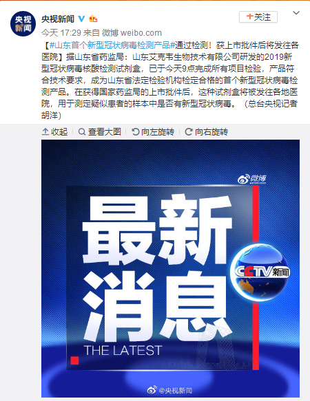 【#山东首个新型冠状病毒检测产品#通过检测!获上市批件后将发往各医院】据山东省药监局:山东艾克韦生物技术有限公司研发的2019新型冠状病毒核酸检测试剂盒,已于今天9点完成所有项目检验,产品符合技术要求,成为山东省法定检验机构检定合格的首个新型冠状病毒检测产品。在获得国家药监局的上市批件后,这种试剂盒将被发往各地医院,用于测定疑似患者的样本中是否有新型冠状病毒。(总台央视记者胡洋)
