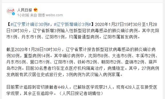 2020年1月27日15时30分至1月28日10时30分,辽宁省新增3例输入性新型冠状病毒感染的肺炎确诊病例。其中沈阳市1例、丹东市1例、辽阳市1例,均属普通型病例。辽阳市属首发病例。