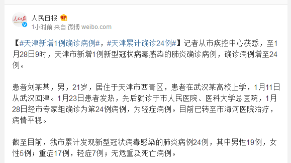 患者刘某某,男,21岁,居住于天津市西青区,患者在武汉某高校上学,1月11日从武汉回津。1月23日患者发热,先后就诊于市人民医院、医科大学总医院,1月28日经市专家组确诊为第24例病例,为轻症病例。目前已转至市海河医院治疗,病情平稳。