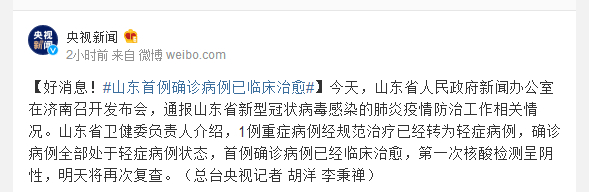 今天,山东省人民政府新闻办公室在济南召开发布会,通报山东省新型冠状病毒感染的肺炎疫情防治工作相关情况。山东省卫健委负责人介绍,1例重症病例经规范治疗已经转为轻症病例,确诊病例全部处于轻症病例状态,首例确诊病例已经临床治愈,第一次核酸检测呈阴性,明天将再次复查。(总台央视记者 胡洋 李秉禅)
