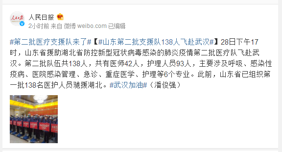 28日下午17时,山东省援助湖北省防控新型冠状病毒感染的肺炎疫情第二批医疗队飞赴武汉。第二批队伍共138人,共有医师42人,护理人员93人,主要涉及呼吸、感染性疫病、医院感染管理、急诊、重症医学、护理等6个专业。此前,山东省已组织第一批138名医护人员驰援湖北。#武汉加油#(潘俊强)