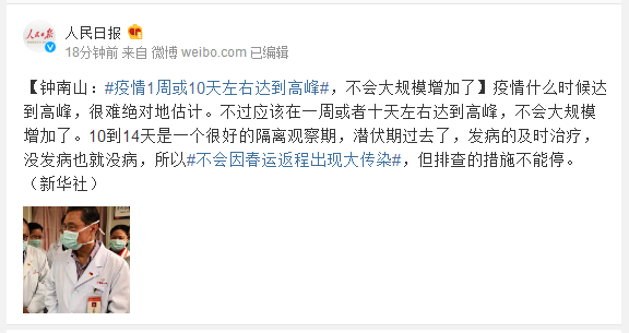 疫情什么时候达到高峰,很难绝对地估计。不过应该在一周或者十天左右达到高峰,不会大规模增加了。10到14天是一个很好的隔离观察期,潜伏期过去了,发病的及时治疗,没发病也就没病,所以#不会因春运返程出现大传染#,但排查的措施不能停。(新华社)