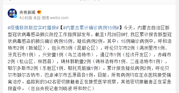 今天,内蒙古自治区新型冠状病毒感染肺炎防控工作指挥部发布,截至1月28日9时, 我区累计报告新型冠状病毒感染的肺炎确诊病例15例,疑似病例2例。其中:15例确诊病例中,呼和浩特市2例(新城区),包头市3例(昆都仑区),呼伦贝尔市2例(满洲里市1例、牙克石市1例),兴安盟1例(乌兰浩特市),通辽市1例(经济开发区),赤峰市2例(松山区、林西县),锡林郭勒盟2例(锡林浩特市1例、二连浩特市1例),鄂尔多斯市2例(东胜区1例、鄂托克前旗1例)。累计报告疑似病例2例,呼伦贝尔市额尔古纳市、巴彦淖尔市五原县各1例。目前,所有病例均在定点医院接受隔离治疗。追踪到的342名密切接触者正在接受医学观察,其他密切接触者正在紧急排查中。(总台央视记者刘晓波 呼和牧仁)