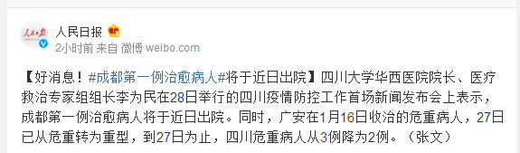 四川大学华西医院院长、医疗救治专家组组长李为民在28日举行的四川疫情防控工作首场新闻发布会上表示,成都第一例治愈病人将于近日出院。同时,广安在1月16日收治的危重病人,27日已从危重转为重型,到27日为止,四川危重病人从3例降为2例。(张文)