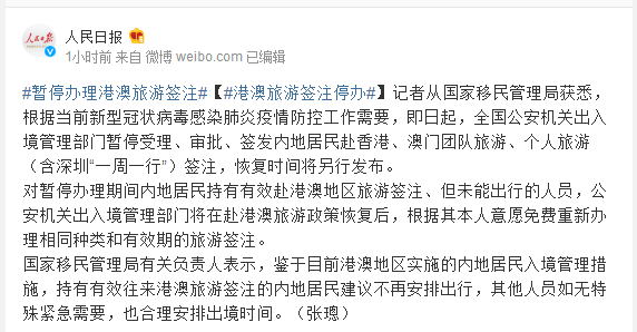 记者从国家移民管理局获悉,根据当前新型冠状病毒感染肺炎疫情防控工作需要,即日起,全国公安机关出入境管理部门暂停受理、审批、签发内地居民赴香港、澳门团队旅游、个人旅游(含深圳“一周一行”)签注,恢复时间将另行发布。