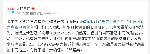【中国医学科学院病原生物学研究所所长:#蝙蝠很可能是病毒源头#,#水貂可能为病毒中间宿主#】对于此次武汉新型冠状病毒的溯源研究,已有大量前期研究认为,蝙蝠是新型冠状病毒(2019-nCov)的起源,但目前尚不清楚中间传播媒介。除此之外,也有研究表明,通过比较脊椎动物宿主的所有病毒的感染模式,发现水貂病毒显示出与2019-nCov更为接近的感染模式。至于水貂是否为新型冠状病毒的中间宿主,有待于进一步确证。(邱超奕)