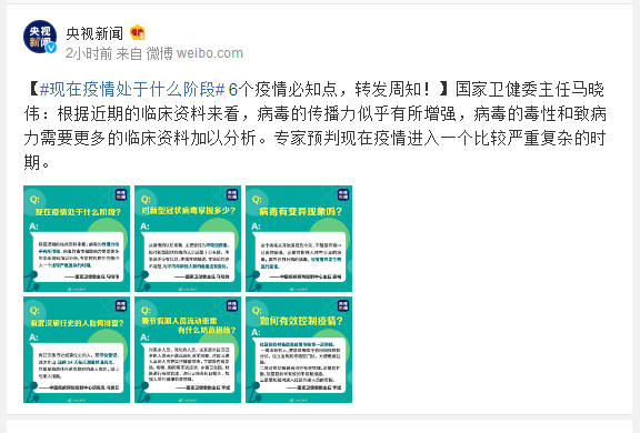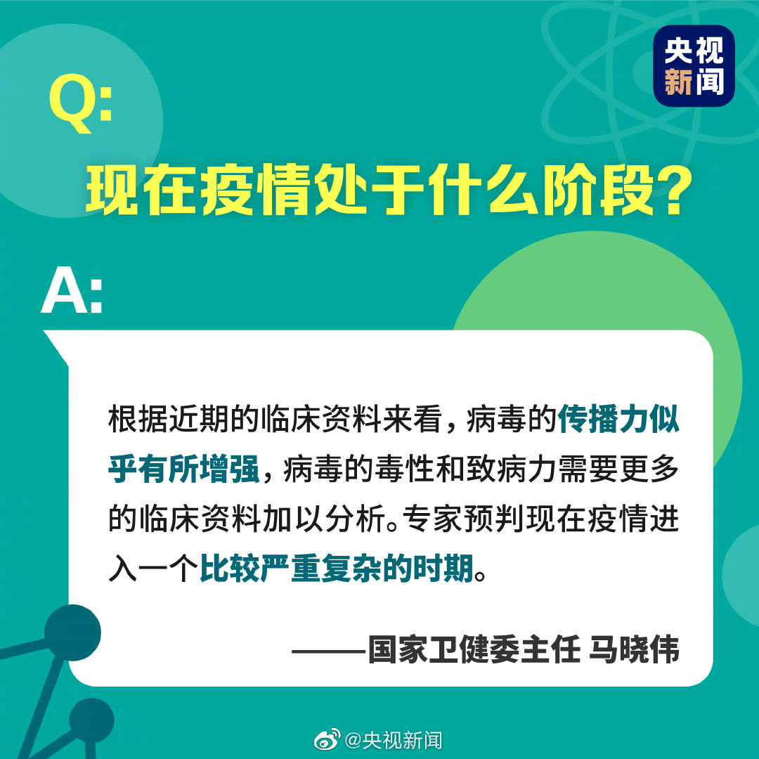 国家卫健委主任马晓伟:根据近期的临床资料来看,病毒的传播力似乎有所增强,病毒的毒性和致病力需要更多的临床资料加以分析。专家预判现在疫情进入一个比较严重复杂的时期。