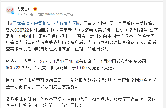 【#日本确诊大巴司机曾载大连旅行团#,目前大连旅行团已全员采取医学措施,曾乘9C8722航班回国】据大连市新型冠状病毒感染的肺炎联防联控指挥部办公室消息,1月28日,网络及媒体报出日本奈良一载过来自中国大连游客的旅游大巴司机确诊为新型冠状病毒感染的肺炎消息后,大连市立即启动核查确认程序,最后查实该司机期间确曾载过大连某旅行社组织的赴日旅行团。