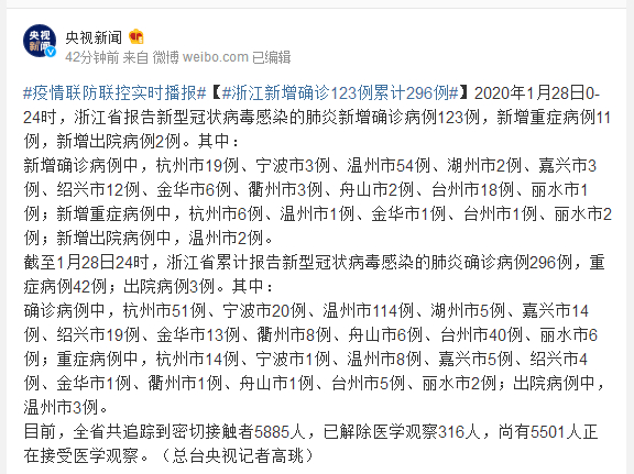2020年1月28日0-24时,浙江省报告新型冠状病毒感染的肺炎新增确诊病例123例,新增重症病例11例,新增出院病例2例。其中: