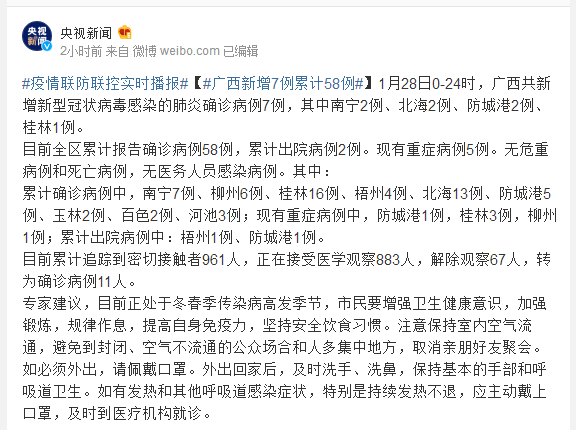 1月28日0-24时,广西共新增新型冠状病毒感染的肺炎确诊病例7例,其中南宁2例、北海2例、防城港2例、桂林1例。