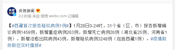 1月28日0-24时,31个省(区、市)报告新增确诊病例1459例,新增重症病例263例,新增死亡病例26例(湖北省25例、河南省1例),新增治愈出院病例43例,新增疑似病例3248例(包括西藏1例)。