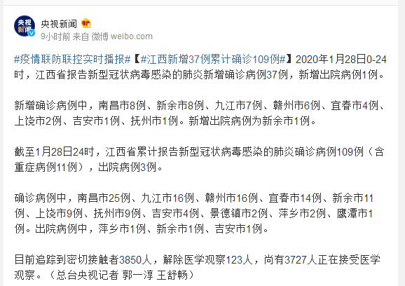 截至1月28日24时,江西省累计报告新型冠状病毒感染的肺炎确诊病例109例(含重症病例11例),出院病例3例。
