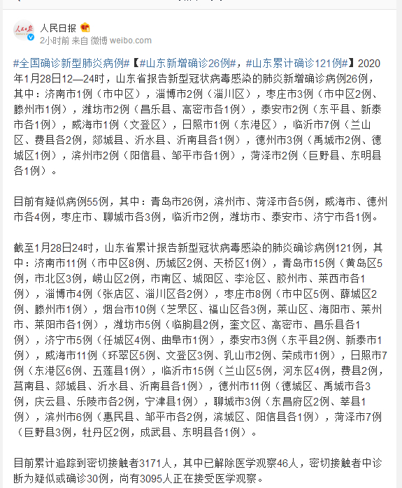 截至1月28日24时,山东省累计报告新型冠状病毒感染的肺炎确诊病例121例,其中:济南市11例(市中区8例、历城区2例、天桥区1例),青岛市15例(黄岛区5例,市北区3例,崂山区2例,市南区、城阳区、李沧区、胶州市、莱西市各1例),淄博市4例(张店区、淄川区各2例),枣庄市8例(市中区5例、薛城区2例、滕州市1例),烟台市10例(芝罘区、福山区各3例,莱山区、海阳市、莱州市、莱阳市各1例),潍坊市5例(临朐县2例,奎文区、高密市、昌乐县各1例),济宁市5例(任城区4例、曲阜市1例),泰安市3例(东平县2例、新泰市1例),威海市11例(环翠区5例、文登区3例、乳山市2例、荣成市1例),日照市7例(东港区6例、五莲县1例),临沂市15例(兰山区5例,河东区4例,费县2例,莒南县、郯城县、沂水县、沂南县各1例),德州市11例(德城区、禹城市各3例,庆云县、乐陵市各2例,宁津县1例),聊城市3例(东昌府区2例、莘县1例),滨州市6例(惠民县、邹平市各2例,滨城区、阳信县各1例),菏泽市7例(巨野县3例,牡丹区2例,成武县、东明县各1例)。