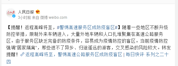 随着一些地区不断升级防控举措,限制外来车辆进入,大量外地车辆和人口扎堆聚集在高速公路服务区。由于服务区缺乏完备的防疫条件,容易成为疫情防控的盲区。当前疫情防控强调“居家隔离”,那些进不了异乡、归途遥远的游客,交叉感染的风险较大。转发提醒!