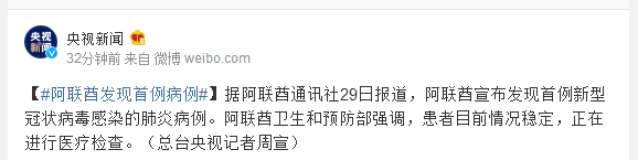 据阿联酋通讯社29日报道,阿联酋宣布发现首例新型冠状病毒感染的肺炎病例。阿联酋卫生和预防部强调,患者目前情况稳定,正在进行医疗检查。(总台央视记者周宣)