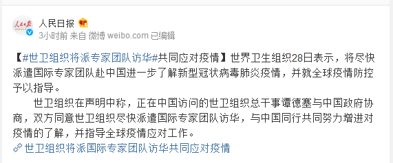 世卫组织在声明中称,正在中国访问的世卫组织总干事谭德塞与中国政府协商,双方同意世卫组织尽快派遣国际专家团队访华,与中国同行共同努力增进对疫情的了解,并指导全球疫情应对工作。