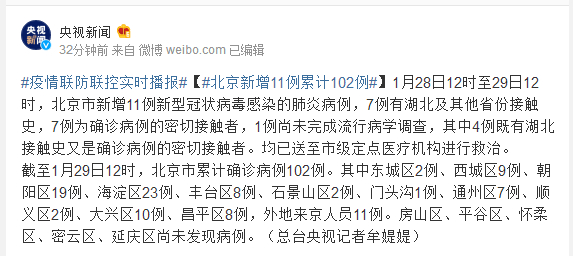 截至1月29日12时,北京市累计确诊病例102例。其中东城区2例、西城区9例、朝阳区19例、海淀区23例、丰台区8例、石景山区2例、门头沟1例、通州区7例、顺义区2例、大兴区10例、昌平区8例,外地来京人员11例。房山区、平谷区、怀柔区、密云区、延庆区尚未发现病例。(总台央视记者牟媞媞)