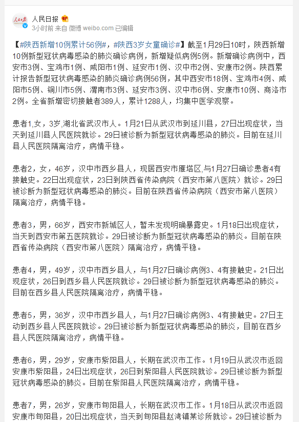 患者4,男,49岁,汉中市西乡县人,与1月27日确诊病例3、4有接触史。21日出现症状,26日到西乡县人民医院就诊。29日被诊断为新型冠状病毒感染的肺炎。目前在西乡县人民医院隔离治疗,病情平稳。