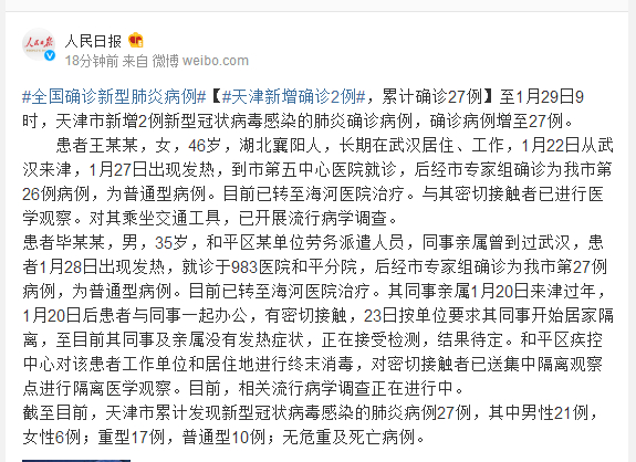 至1月29日9时,天津市新增2例新型冠状病毒感染的肺炎确诊病例,确诊病例增至27例。