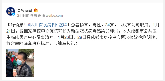 患者杨某,男性,34岁,武汉某公司职员,1月21日,经国家疾控中心复核确诊为新型冠状病毒感染的肺炎,收入成都市公共卫生临床医疗中心隔离治疗,1月26日、28日经成都市疾控中心两次核酸检测阴性,符合解除隔离治疗标准。(神鸟知讯)