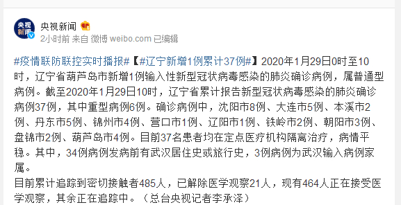 2020年1月29日0时至10时,辽宁省葫芦岛市新增1例输入性新型冠状病毒感染的肺炎确诊病例,属普通型病例。截至2020年1月29日10时,辽宁省累计报告新型冠状病毒感染的肺炎确诊病例37例,其中重型病例6例。确诊病例中,沈阳市8例、大连市5例、本溪市2例、丹东市5例、锦州市4例、营口市1例、辽阳市1例、铁岭市2例、朝阳市3例、盘锦市2例、葫芦岛市4例。目前37名患者均在定点医疗机构隔离治疗,病情平稳。其中,34例病例发病前有武汉居住史或旅行史,3例病例为武汉输入病例家属。