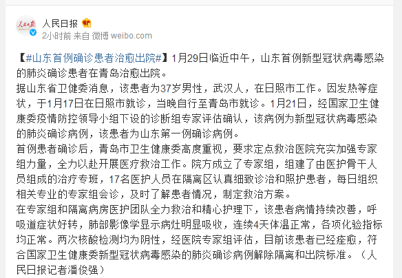 1月29日临近中午,山东首例新型冠状病毒感染的肺炎确诊患者在青岛治愈出院。