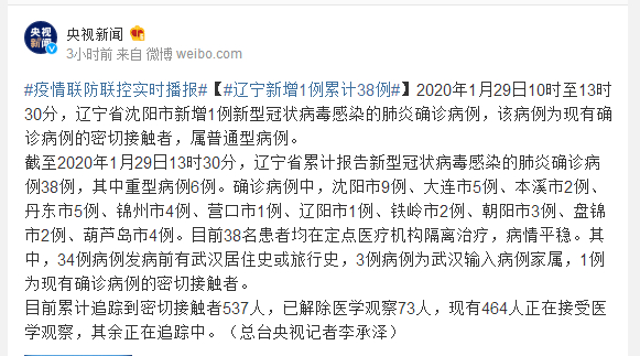 2020年1月29日10时至13时30分,辽宁省沈阳市新增1例新型冠状病毒感染的肺炎确诊病例,该病例为现有确诊病例的密切接触者,属普通型病例。