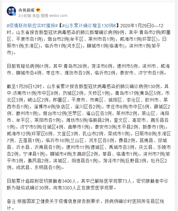 截至1月29日12时,山东省累计报告新型冠状病毒感染的肺炎确诊病例130例,其中:济南市11例(市中区8例,历城区2例,天桥区1例),青岛市17例(黄岛区5例,市北区3例,崂山区2例,即墨区、平度市、市南区、城阳区、李沧区、胶州市、莱西市各1例),淄博市4例(张店区、淄川区各2例),枣庄市8例(市中区5例、薛城区2例、滕州市1例),烟台市12例(芝罘区、福山区各3例,莱州市2例,莱山区、海阳市、牟平区、莱阳市各1例),潍坊市5例(临朐县2例,奎文区、高密市、昌乐县各1例),济宁市5例(任城区4例、曲阜市1例),泰安市3例(东平县2例、新泰市1例),威海市12例(环翠区6例、文登区3例、乳山市2例、荣成市1例),日照市8例(东港区7例、五莲县1例),临沂市16例(兰山区、河东区各5例,费县2例,莒南县、郯城县、沂水县、沂南县各1例),德州市11例(德城区、禹城市各3例,庆云县、乐陵市各2例,宁津县1例),聊城市4例(东昌府区2例,莘县、临清市1例),滨州市7例(邹平市3例,惠民县2例,滨城区、阳信县各1例),菏泽市7例(巨野县3例,牡丹区2例,成武县、东明县各1例)。