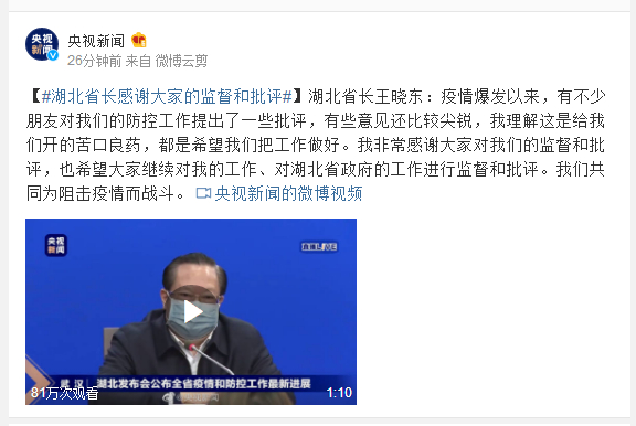 湖北省长王晓东:疫情爆发以来,有不少朋友对我们的防控工作提出了一些批评,有些意见还比较尖锐,我理解这是给我们开的苦口良药,都是希望我们把工作做好。我非常感谢大家对我们的监督和批评,也希望大家继续对我的工作、对湖北省政府的工作进行监督和批评。我们共同为阻击疫情而战斗。