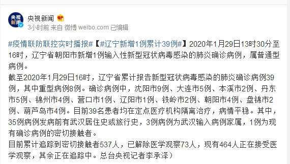 2020年1月29日13时30分至16时,辽宁省朝阳市新增1例输入性新型冠状病毒感染的肺炎确诊病例,属普通型病例。