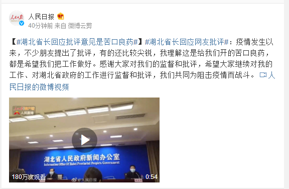 【#湖北省长回应批评意见是苦口良药#】#湖北省长回应网友批评#:疫情发生以来,不少朋友提出了批评,有的还比较尖锐,我理解这是给我们开的苦口良药,都是希望我们把工作做好。感谢大家对我们的监督和批评,希望大家继续对我的工作、对湖北省政府的工作进行监督和批评,我们共同为阻击疫情而战斗。