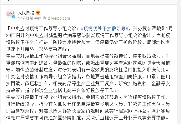 【中央应对疫情工作领导小组会议:#疫情仍处于扩散阶段#,形势复杂严峻】1月29日召开的中央应对新型冠状病毒感染肺炎疫情工作领导小组会议指出,当前疫情防控正在全面推进,防控力度持续加大,但疫情仍处于扩散阶段,局部地区有迅速上升趋势,形势复杂严峻。