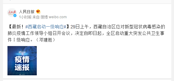 29日上午,西藏自治区应对新型冠状病毒感染的肺炎疫情工作领导小组召开会议,决定自即日起,全区启动重大突发公共卫生事件Ⅰ级响应。(邓建胜)