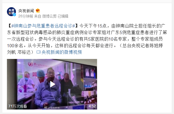 今天下午15点,由钟南山院士担任组长的广东省新型冠状病毒感染的肺炎重症病例会诊专家组对广东5例危重症患者进行了第一次远程会诊。参与今天远程会诊的有共5家医院的10名专家,整个专家组成员100余名。从今天开始,这样的远程会诊每天都会进行。(总台央视记者陈旭婷 刘帆 邓裕达)