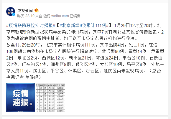 截至1月29日20时,北京市累计确诊病例111例,其中出院4例,死亡1例,在治106例确诊病例均在市级定点医院进行隔离治疗,普通型90例,重型14例,危重型2例。东城区2例、西城区12例、朝阳区21例、海淀区24例、丰台区10例、石景山区2例、门头沟区1例、通州区8例、顺义区2例、大兴区10例、昌平区8例,外地来京人员11例。房山区、平谷区、怀柔区、密云区、延庆区尚未发现病例。(总台央视记者 牟媞媞)
