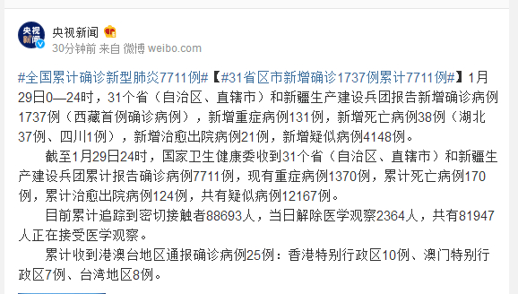 截至1月29日24时,国家卫生健康委收到31个省(自治区、直辖市)和新疆生产建设兵团累计报告确诊病例7711例,现有重症病例1370例,累计死亡病例170例,累计治愈出院病例124例,共有疑似病例12167例。