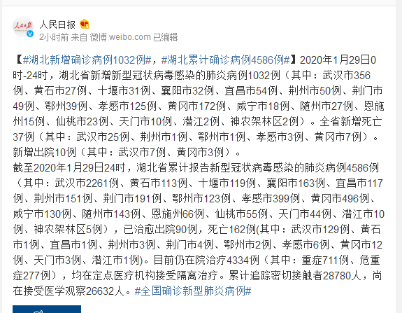 截至2020年1月29日24时,湖北省累计报告新型冠状病毒感染的肺炎病例4586例(其中:武汉市2261例、黄石市113例、十堰市119例、襄阳市163例、宜昌市117例、荆州市151例、荆门市191例、鄂州市123例、孝感市399例、黄冈市496例、咸宁市130例、随州市143例、恩施州66例、仙桃市55例、天门市44例、潜江市10例、神农架林区5例),已治愈出院90例,死亡162例(其中:武汉市129例、黄石市1例、宜昌市1例、荆州市3例、荆门市4例、鄂州市2例、孝感市6例、黄冈市12例、天门市3例、潜江市1例)。目前仍在院治疗4334例(其中:重症711例、危重症277例),均在定点医疗机构接受隔离治疗。累计追踪密切接触者28780人,尚在接受医学观察26632人。