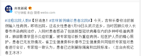 今天,吉林长春收治的首例输入性病例,即将出院。这名女性患者1月19日从武汉返乡,当时因肺炎收入长春市传染病院治疗,入院时患者感染了包括新型冠状病毒在内的多种呼吸道病原体,肺部影像学显示炎症较重,被专家组诊断为重症病例。经医护人员的精心照护,患者已无发热情况。省卫生健康委和长春市卫生健康委共同组织专家组对患者进行会诊,专家组一致认为,患者已达到解除隔离和出院标准。(总台央视记者王冰冰)