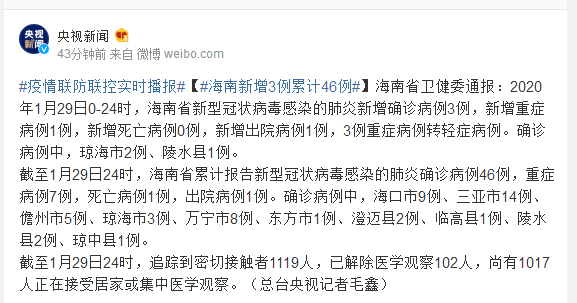 海南省卫健委通报:2020年1月29日0-24时,海南省新型冠状病毒感染的肺炎新增确诊病例3例,新增重症病例1例,新增死亡病例0例,新增出院病例1例,3例重症病例转轻症病例。确诊病例中,琼海市2例、陵水县1例。