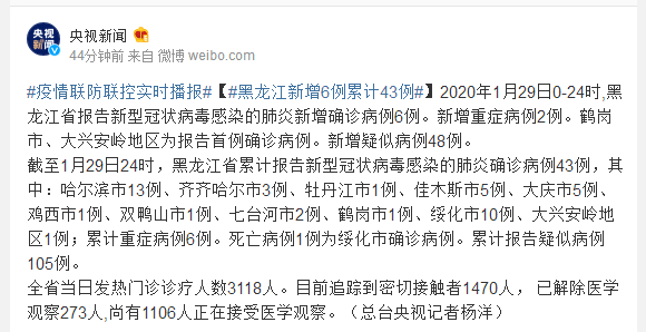 2020年1月29日0-24时,黑龙江省报告新型冠状病毒感染的肺炎新增确诊病例6例。新增重症病例2例。鹤岗市、大兴安岭地区为报告首例确诊病例。新增疑似病例48例。
